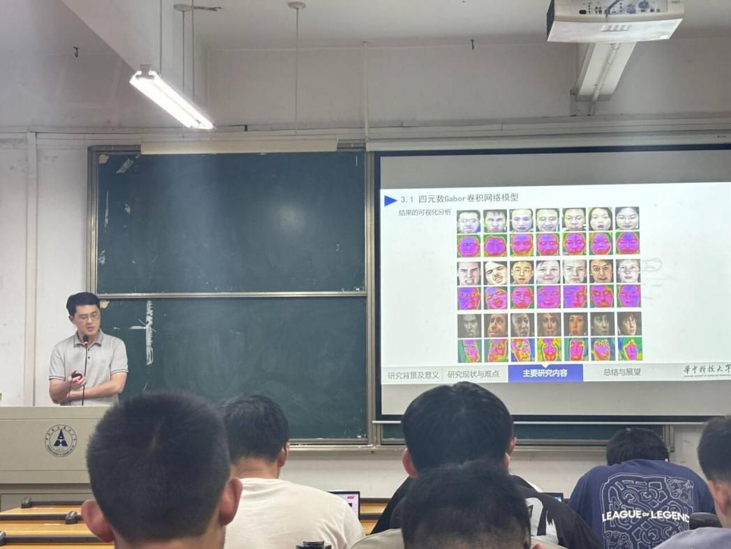 讲座正式开始后,周宇老师介绍了自己从硕士阶段开始对人脸表情识别这一研究领域产生浓厚研究兴趣的过程,鼓励同学们找到自己感兴趣的研究方向,并从人脸表情识别的研究背景和意义、研究现状和难点、主要研究内容、领域未来展望四个层面进行了详细介绍。周宇老师介绍了四元数理论。介绍基于四元数神经网络的人脸表情识别结合了四元数神经网络的旋转不变性、特征提取和模式匹配等先进技术,以及高容量的网络架构和几何特征损失函数,为实现高效、准确的人脸表情识别提供了有力的技术支持。人脸表情识别在人机交互、安全领域、医疗健康、智能家居、智慧课堂、金融服务等领域均有重要应用。随后,周宇老师又重点介绍四元数胶囊网络等技术。