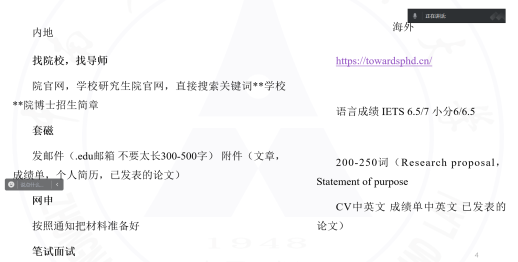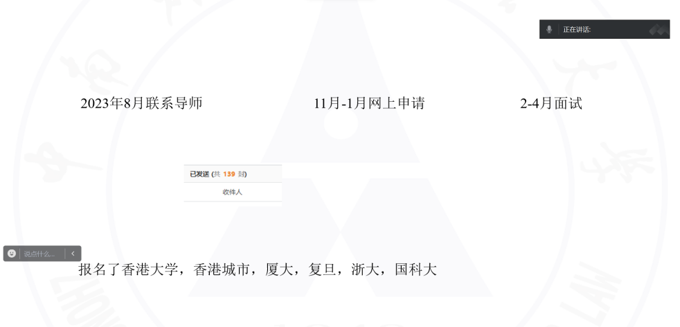 随后,阮伟乔分享了申请博士期间的过程和细节。他于2023年8月开始联系导师,期间累计发送申请邮件达139封,报名的学校涵盖香港大学、香港城市大学、厦门大学等众多国内顶尖高校。阮伟乔表示,博士申请是个漫长而艰辛的过程,在院校、导师确定过程中要找准方向,把握好节奏,既不能好高骛远,也不要因某次申请失败而失去信心。随后,阮伟乔就如何准备网申以及笔试面试进行了详细分享。