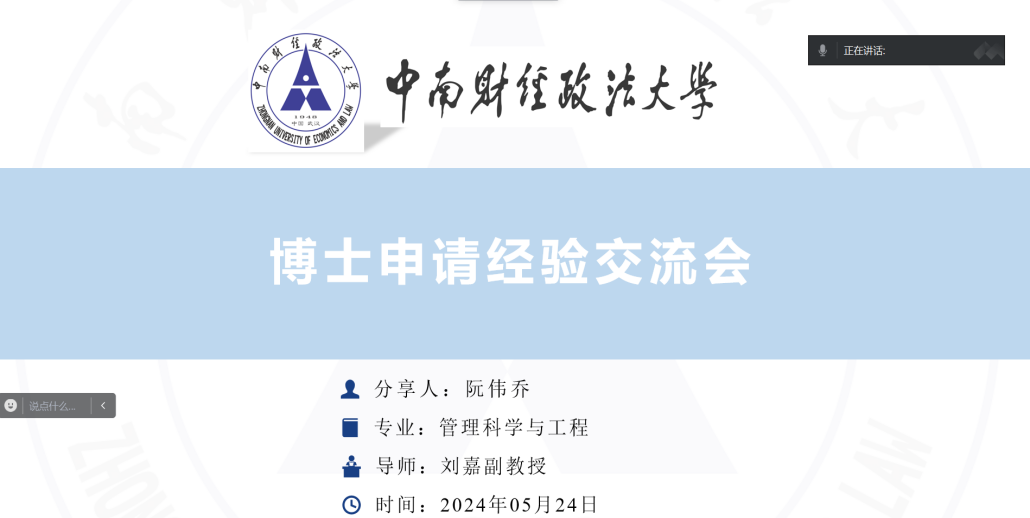 本次活动邀请了2021级管理科学与工程专业的研究生阮伟乔进行经验分享。阮伟乔在校期间多次参与各类学术会议及科研竞赛,并于近期成功申请于厦门大学攻读博士学位。