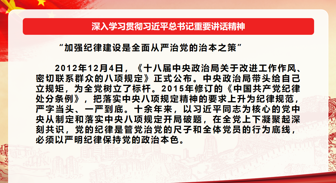 会议第二项:深入学习贯彻习近平总书记重要理论精神。按照党中央部署,今年4月至7月,在全党开展党纪学习教育,本次主题党日重点学习《论党的自我革命》第29-32页相关内容,深刻领悟习近平总书记“必须把反腐倡廉当作政治必修课”这一论述的重大意义,要求大家要切实增强党性、切实遵守组织制、切实加强组织管理。