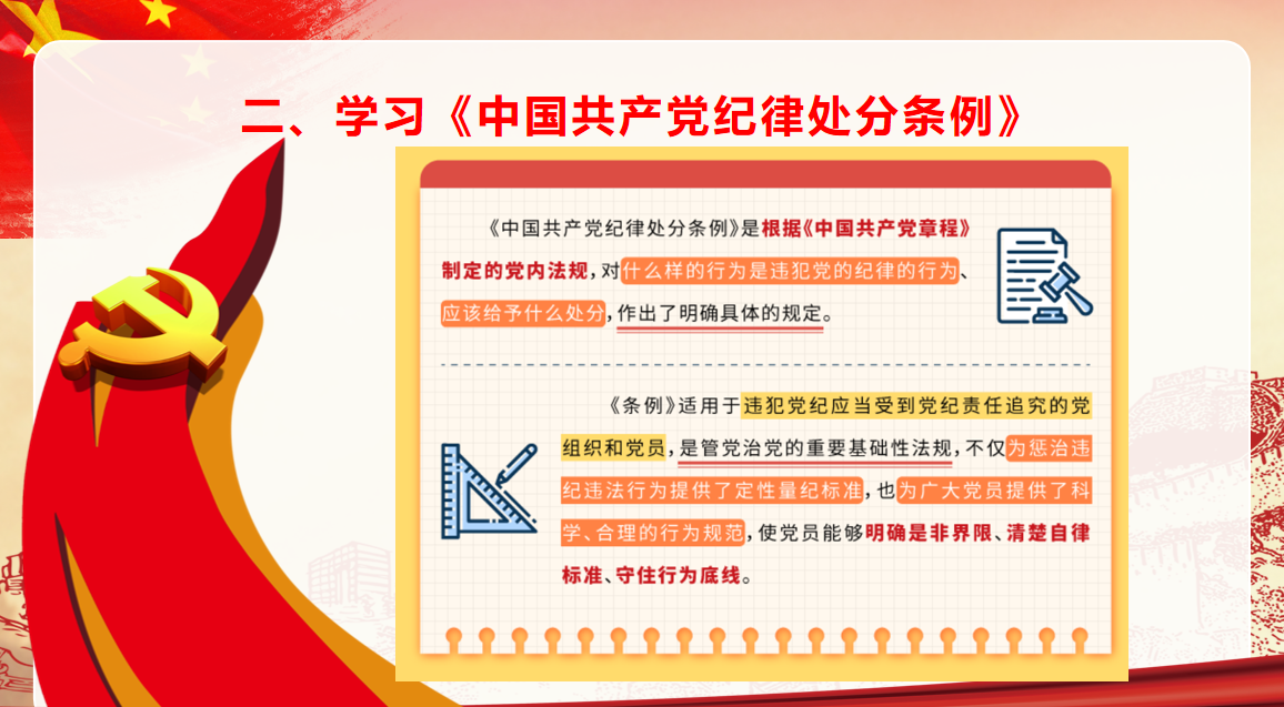 会议第三项,学习新修订《中国共产党纪律处分条例》。在党支部组织委员宿家杰的带领之下,组织支部广大党员学习新修订《中国共产党纪律处分条例》,重点学习第七章和第八章,对新修订的部分逐章逐条、联系实际、原原本本进行学习。党日活动会议号召支部党员要更加强调严明组织纪律和廉洁纪律,争做忠诚于党、廉洁为民、勇于担当的青年表率。