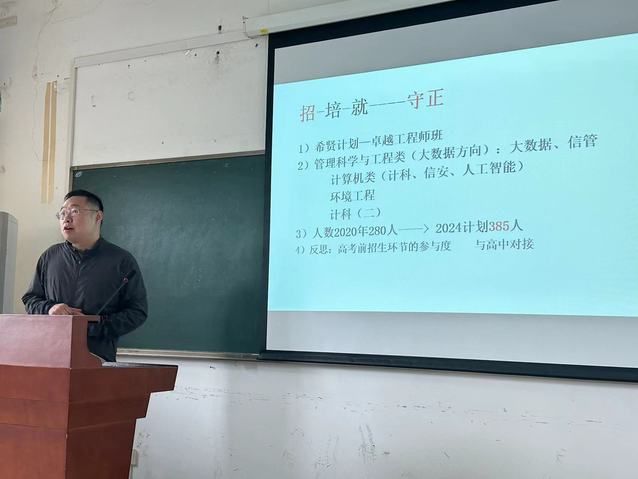 接着,从招生——培养——就业三个环节对本科教学相关工作进行布置安排。在招生环节,介绍了学院本科专业设置,现有信息管理与信息系统、计算机科学与技术2个国家一流本科建设专业;大数据管理与应用+金融工程、人工智能+会计学2个双学位培养专业;信息安全、环境工程2个特色专业。2024年学院对本科招生专业类别进行重新划分,将原计算机类调整更新为计算机类、管理科学与工程类(大数据方向),并增设计算机科学与技术(卓越工程师实验班),入选“希贤”计划,实行本硕贯通培养。在培养环节,强调了2024版培养方案修订工作,以及对应的课程大纲更新,要求大家按照通知要求保质保量完成相关工作。还就课堂教学和实验教学提出了明确要求和改进建议。在就业环节,介绍了学院国际合作办学和计算机科学与技术(二学位)项目。