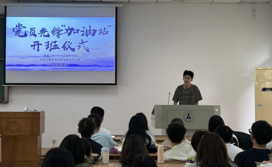 (学生通讯员 余子烨)为进一步加强学风建设,落实立德树人根本任务,发挥朋辈育人力量、入党积极分子先锋模范作用,帮扶转专业和学习困难学生。信息工程学院学习发展中心联合本科生第三党支部举办“红色先锋‘加油站’”学习班,开班仪式于5月31日下午在文泽306顺利举行。院学习发展中心主任焦馨蕙、本科生第三党支部书记刘杰鑫、23级入党积极分子以及学生代表共60余人参加此次仪式。仪式由郭峰岑主持。