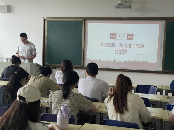 讨论预备党员陈茜、张贞港同志按期转正问题。本次大会研究生第二党支部应到党员44人,其中正式党员40人,预备党员4人。实到会党员26人,其中正式党员23人,预备党员3人。