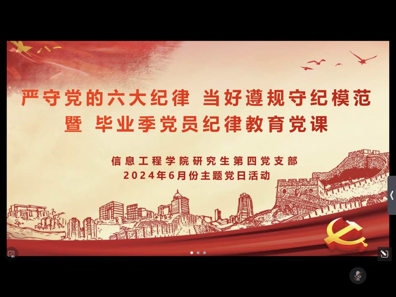 在毕业季来临之际,为进一步加强党员纪律教育,提升党员遵规守纪意识,信息工程学院研究生第四党支部于2024年6月17日晚召开6月主题党日活动,主题为“严守党的六大纪律,当好遵规守纪模范”的党日活动。此次活动旨在激励广大党员特别是即将走出校园的毕业生党员,坚守初心使命,严守党纪国法,以饱满的热情和坚定的信念走向人民需要的地方。