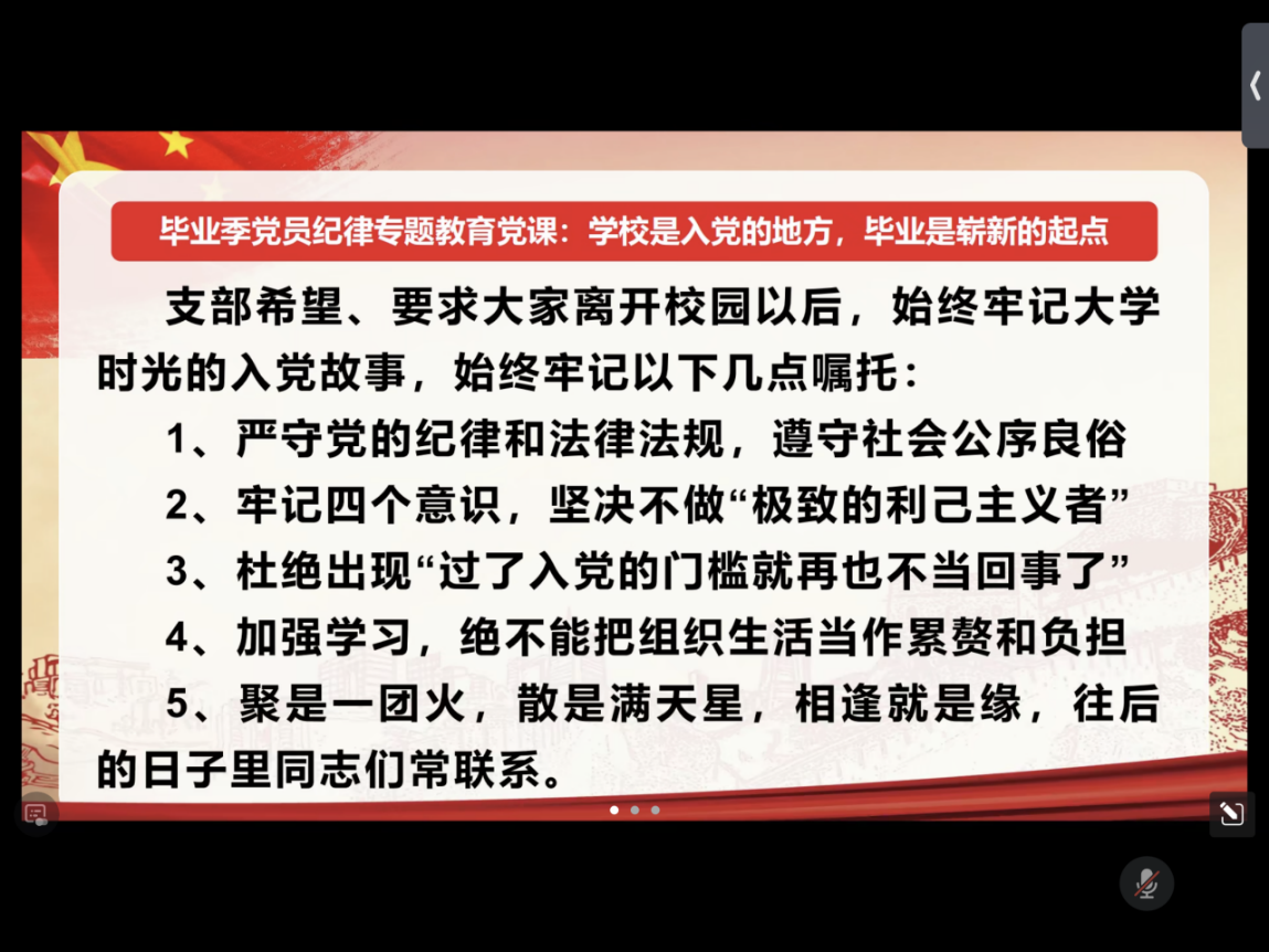 会议第五项,针对毕业季党员的特点,活动还特别安排了“坚守出新使命,严守党纪国法,坚定走向人民需要的地方”的专题教育党课。党课内容紧密结合当前形势和毕业党员的实际需求,引导大家深入思考如何在新的岗位上发挥党员的先锋模范作用,为实现中华民族伟大复兴的中国梦贡献力量。