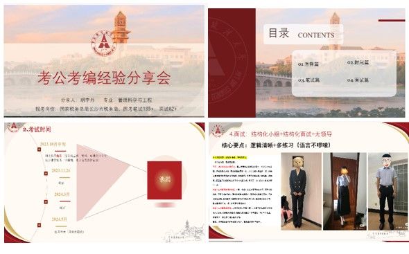 第三位分享嘉宾是胡李丹,就业去向为湖南省税务局。胡李丹分享了如何选择合适的岗位、把握考试时间、准备面试和笔试的关键要点。她强调了确定职业目标的重要性,并提供了国家和省级公务员考试的关键时间信息,在笔试方面重点介绍了行政职业能力测验和申论的基本要求,并建议同学们制定有效的复习计划。最后,胡李丹分享了面试准备的核心技巧,并指导同学们如何获取考试相关信息。