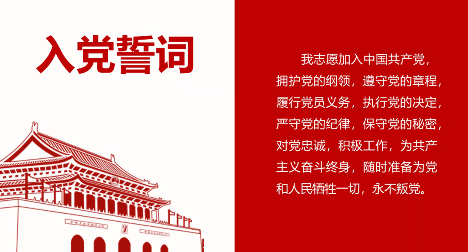 会议第一项,重温入党誓词。在党支部书记吕凯华同志的带领下,党支部全体成员佩戴党员徽章庄严肃立,集体重温了入党誓词。