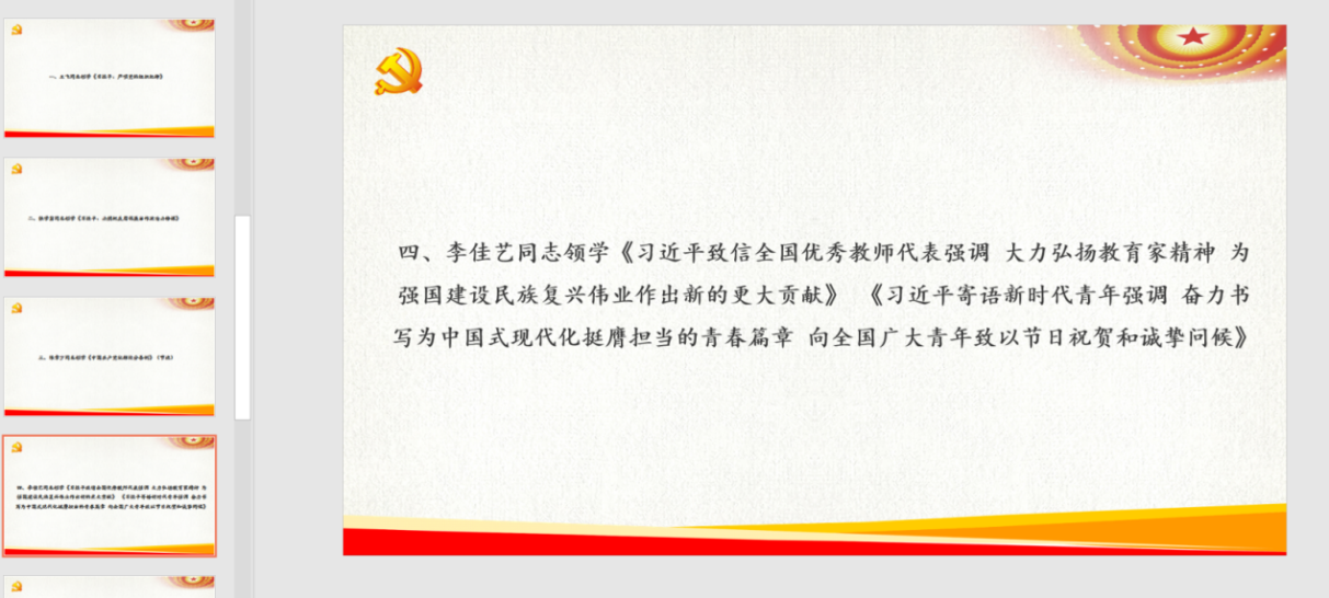 接下来,李佳艺同志领学《习近平致信全国优秀教师代表强调 大力弘扬教育家精神 为强国建设民族复兴伟业作出新的更大贡献》以及《习近平寄语新时代青年强调 奋力书写为中国式现代化挺膺担当的青春篇章 向全国广大青年致以节日祝贺和诚挚问候》,习近平在致全国优秀教师的信中说,长期以来,以你们为代表的全国广大教师认真贯彻党的教育方针,教书育人、培根铸魂,培养了一代又一代德智体美劳全面发展的社会主义建设者和接班人,造就了大批可堪大用、能担重任的栋梁之才,为国家发展、民族振兴作出了重要贡献。习近平在对新青年的寄语中指出,新时代新征程上,全国各族青年听从党和人民的召唤,在科技创新、乡村振兴、绿色发展、社会服务、卫国戍边等各领域各方面勇当排头兵和生力军,展现出自信自强、刚健有为的精神风貌。党中央对广大青年充分信任、寄予厚望!