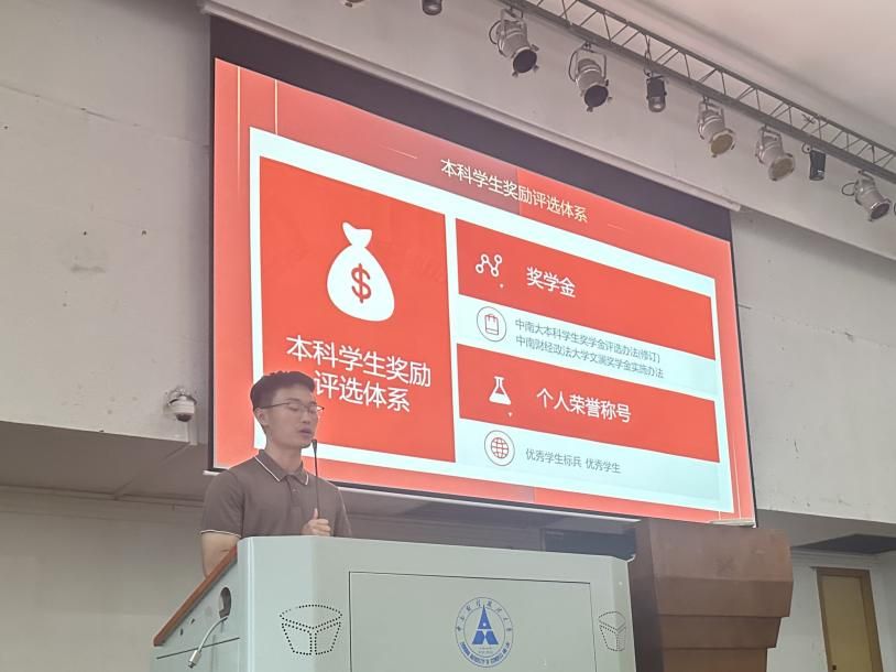针对奖学金评定工作,刘杰鑫详细介绍了奖学金种类、评选依据和评选流程,并鼓励同学们积极参与奖学金评选。