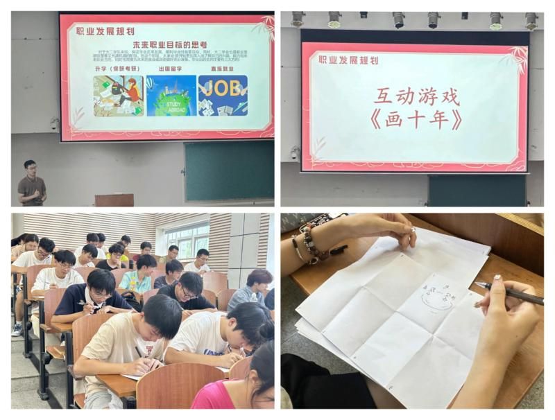 随后,刘杰鑫聚焦职业发展规划,倡导同学们通过职业测评等多方式找准定位,通过实习、社团等多途径积累经验,并强调保持“好奇心”和“求知欲”和养成“终身学习”习惯的重要性。为促思考,他组织《画十年》互动游戏,让同学们以画绘梦,激发对未来职业生涯的憧憬与奋斗热情,寓教于乐中明确人生蓝图,为梦想启航蓄力。
