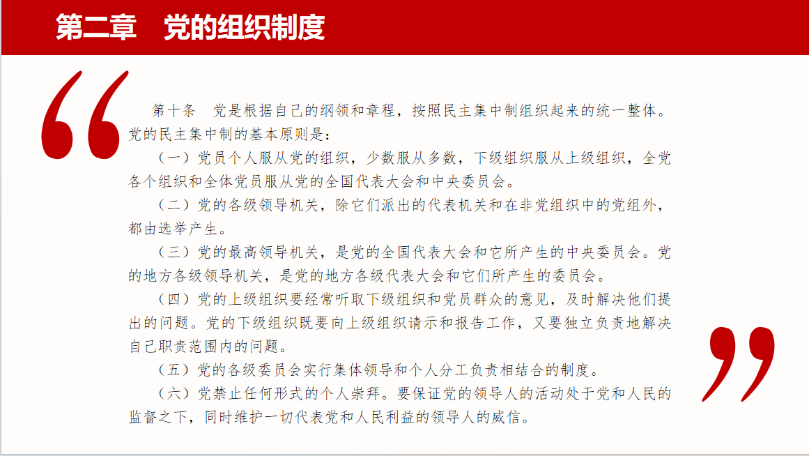 活动第三项,集体学习党章。本次党日活动学习党章第二章:《党的组织制度》。党是根据自己的纲领和章程,按照民主集中制组织起来的统一整体,要求党的各级组织严格执行少数服从多数、下级服从上级的原则,确保党的决定和政策得到有效执行。着重强调党禁止任何形式的个人崇拜,要保证党的领导人的活动处于党和人民的监督之下,维护一切代表党和人民利益的领导人的威信。同时,党组织要重视自身建设,经常检查和讨论各项工作,以保持党的先进性和纯洁性。作为学生党员,在今后的学习工作中,我们要严格遵守党的组织制度,认真履行党员义务,积极参与党内生活,做到个人服从组织,少数服从多数,下级服从上级,展现出学生党员的良好形象。