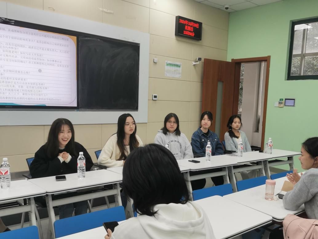 (通讯员 吴可莹 陈孝丁敬)10月20日下午14 : 30,“辅梦前行 逐梦启航”——2022级助力就业升学专项计划·保研经验分享交流会在文波智慧教室109举行。本次活动由本科2022级主办,2022级辅导员陈孝丁敬老师、2021级保研同学代表、部分2022级同学参加本次交流会。