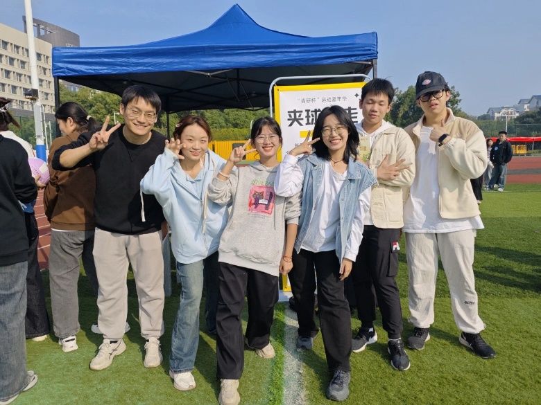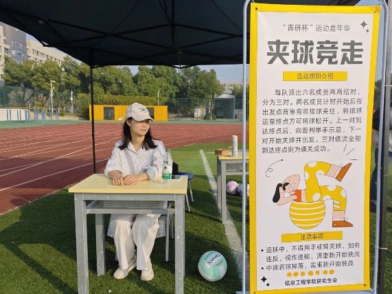 信息工程学院研究生会负责的是“夹球竞走”项目,该项目因其独特的趣味性和团队协作性而深受大家喜欢。比赛规则要求每支队伍派出六名队员,两两一组,共三组同时参赛。队员们需要用背部紧紧夹着球前行,整个过程中不能用手触碰球,需在规定的六分钟内完成指定赛程。挑战成功后,即可获得一枚贴纸作为集章凭证。