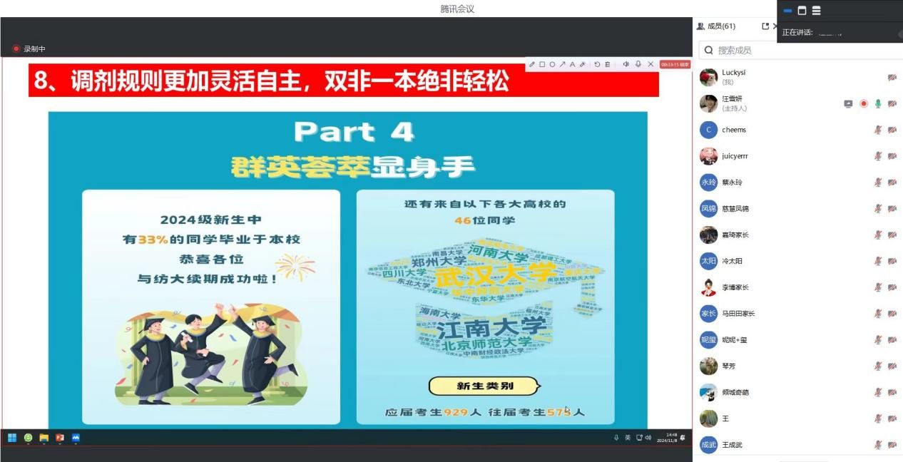 本次讲座线上线下同步进行,不仅线下同学们踊跃参与、反响热烈,家长们也通过线上会议积极参与了进来。会议在家校之间构建起了沟通的桥梁,为共同助力学生考研升学奠定了坚实的基础。