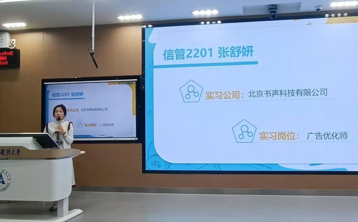 赵博妍同学重点介绍了政府机关实习渠道的获取方式,强调了积极关注班级与年级群消息的重要性。