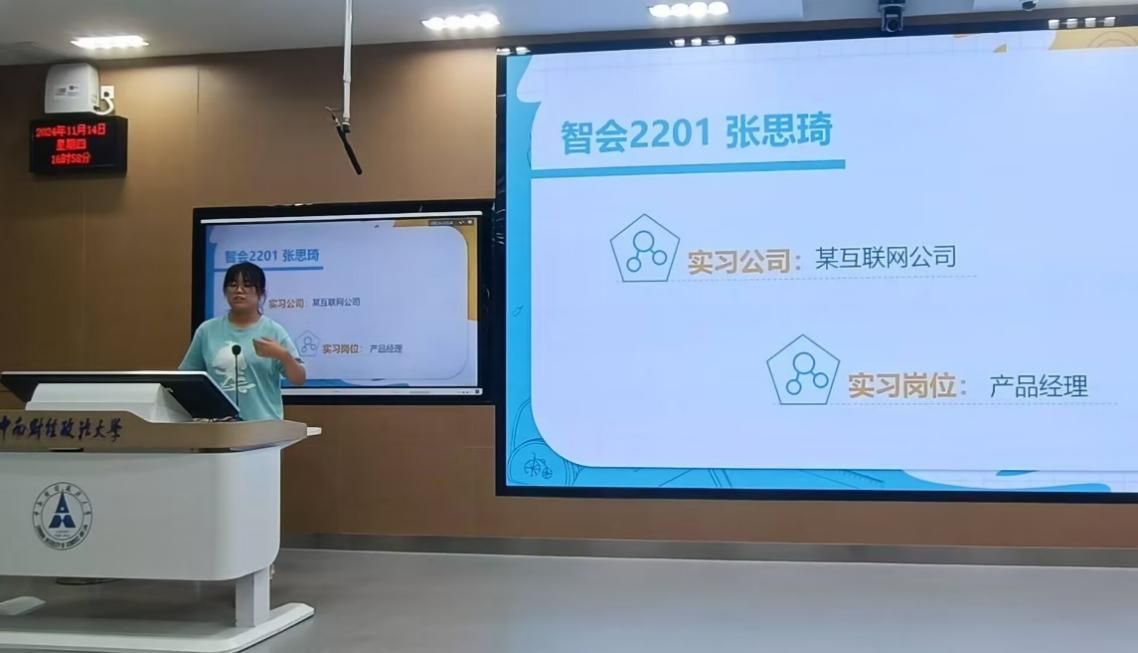 张思琦同学详细介绍了自己在产品经理岗位上的实习内容,让同学们对这一岗位的工作职责和求职准备有了更深入的了解。