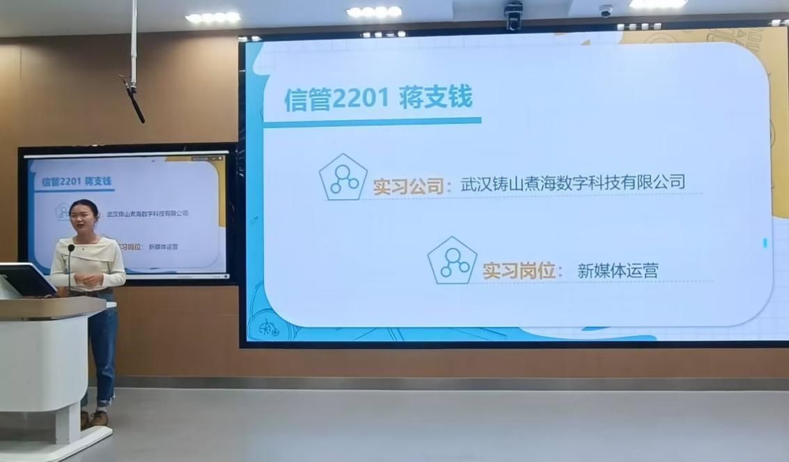 蒋支钱同学分享了自己作为新媒体运营的实习经历,表示自己实习期间收获丰富、体验愉快,鼓励同学们多多走出校门,开阔眼界,丰富体验。