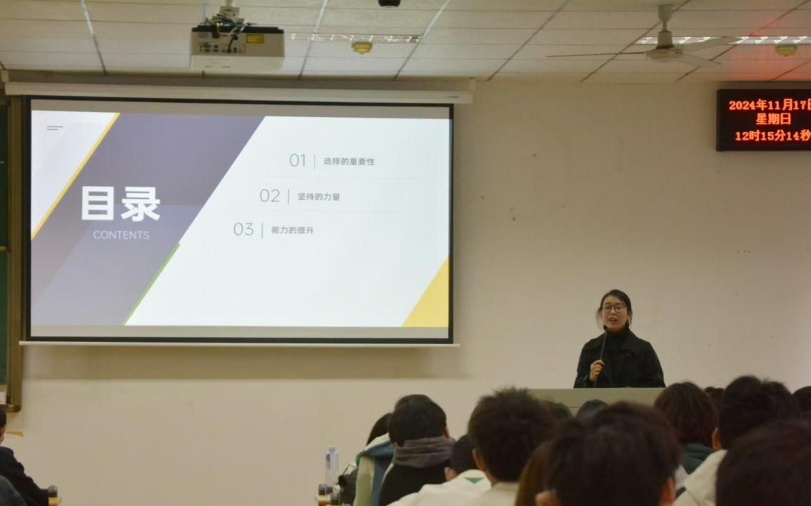 接着,2024届优秀毕业生邓钰燕围绕“本科毕业就去工作的生活到底怎么样”的主题展开分享。她从选择的重要性、坚持的力量、能力的提升三个方面,根据自身经历讲述了从校园踏入职场的感受和启发,为同学们描绘了一幅既真实又充满希望和挑战的职场生活画卷。