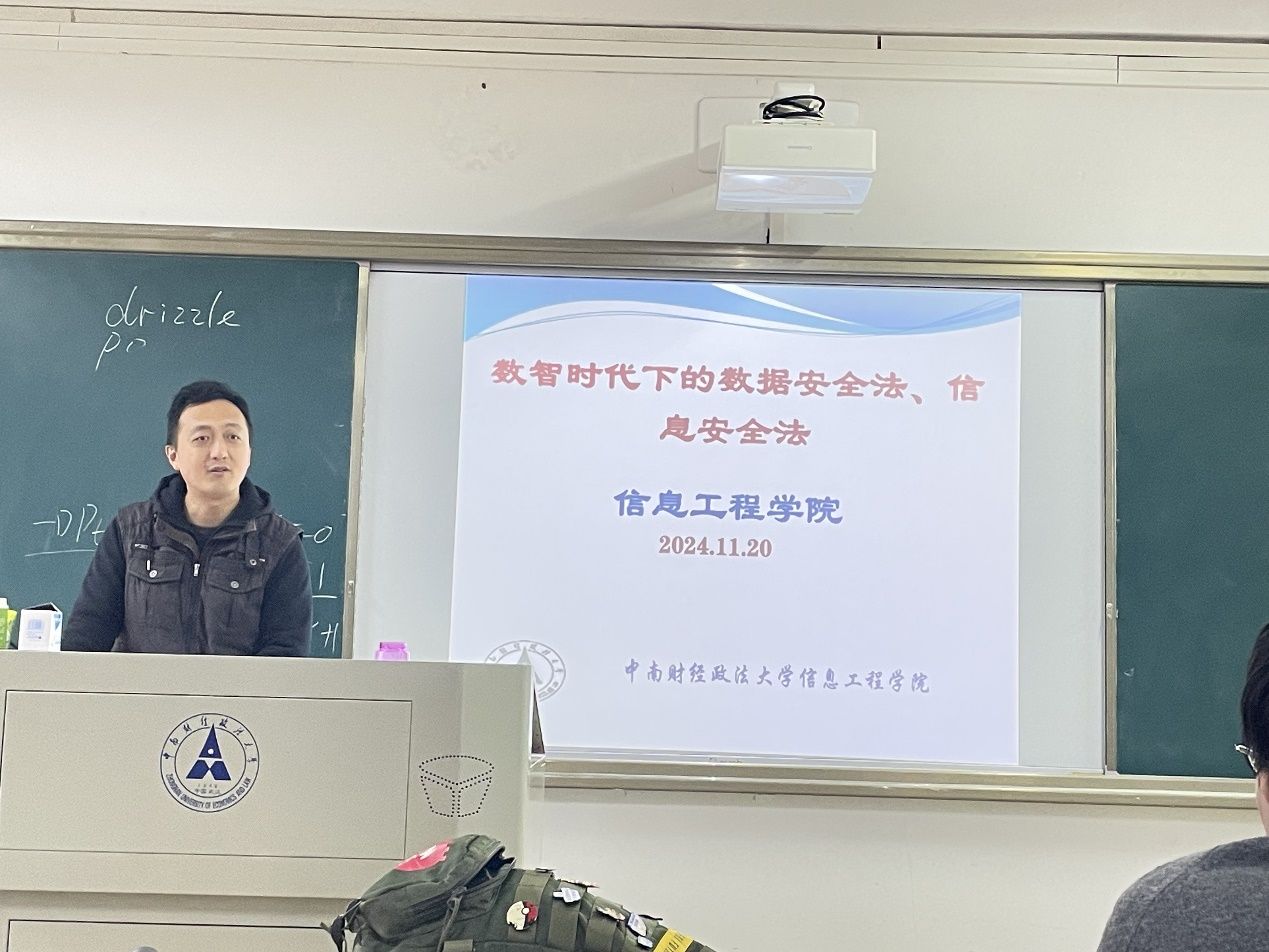 2024年11月20日下午4点在文添楼206,作为学院实习基地的企业负责人和研究生校外合作导师,湖北广煜泰华知识产权金融服务有限公司,武汉东湖新技术开发区民商事金融调解中心法定代表人吴晓帆为我院2024级管理科学与工程学硕开展了题为《数智时代下的数据安全法和信息安全法》讲座。讲座围绕《中华人民共和国数据安全法》《中华人民共和国个人信息保护法》的核心内容,结合支付宝、花呗等案例,对学生进行了数据安全法、信息安全法的教育。