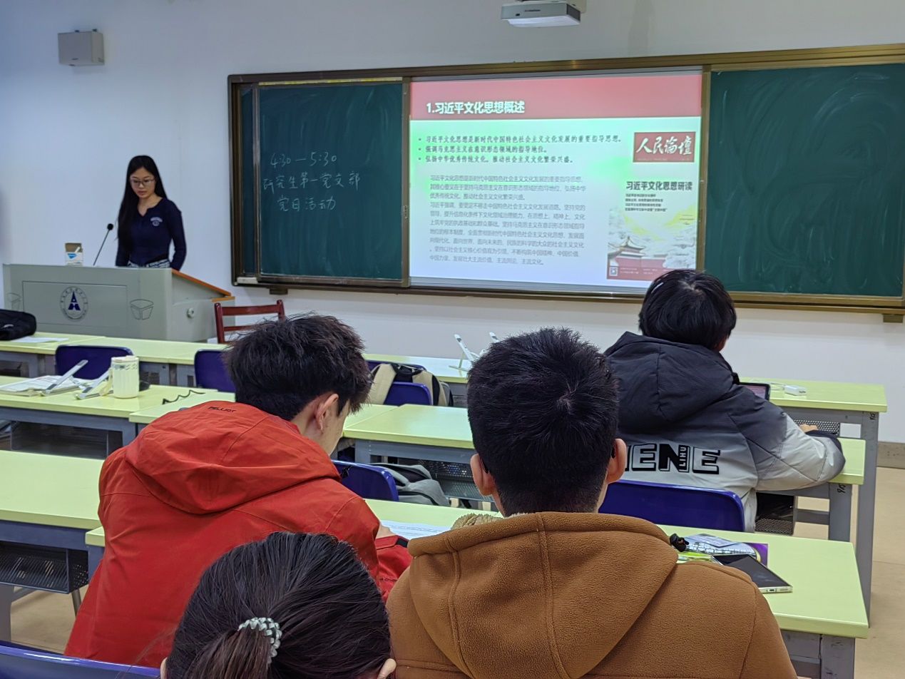 活动第三项,专题学习。深入学习习近平文化思想,在朱怡然同志的带领下,支部党员学习了习近平文化思想概述,习近平文化思想是新时代中国特色社会主义文化发展的重要指导思想,强调马克思主义在意识形态领域的指导地位,要大力弘扬中华优秀传统文化,推动社会主义文化繁荣兴盛。