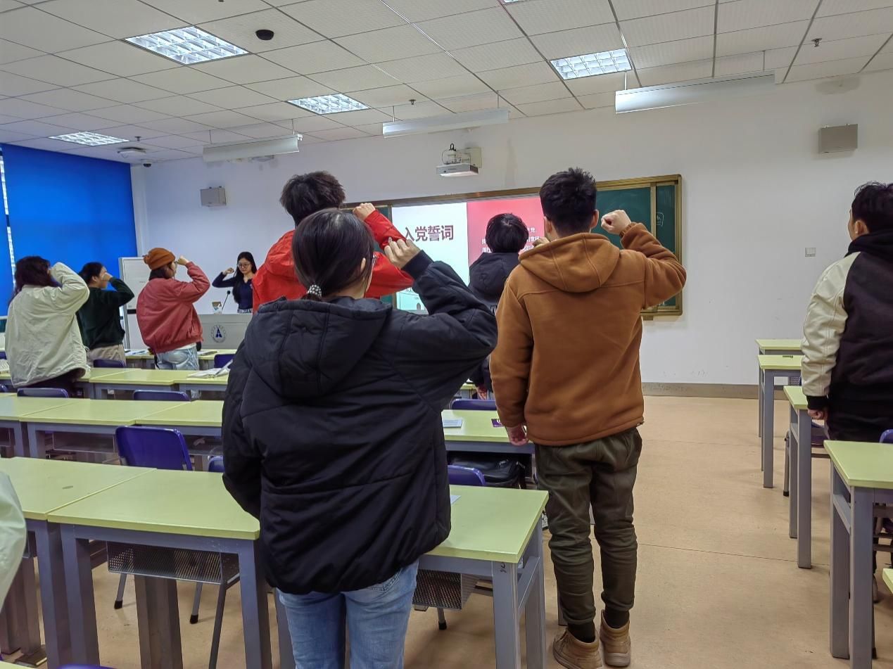 活动第一项,重温入党誓词。支部全体党员佩戴党员徽章,在主持人朱怡然同志的带领下重温入党誓词。