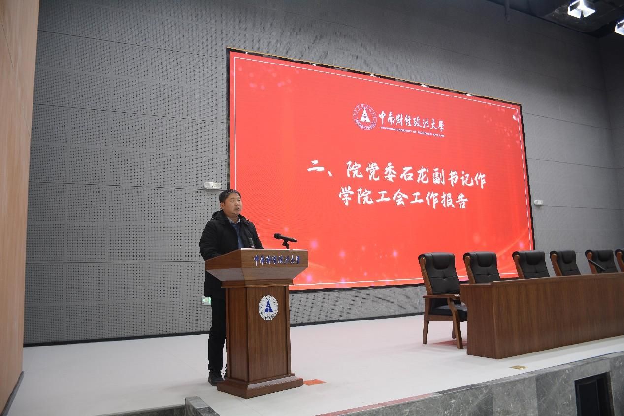 学院党委副书记石龙代表工会作了题为《凝聚职工力量 助力学院发展》的工会工作报告,从思想建设、组织建设、民主管理、信息公开、福利保障和文体活动等方面对2024年工作进行总结,并对2025年工作计划进行说明。