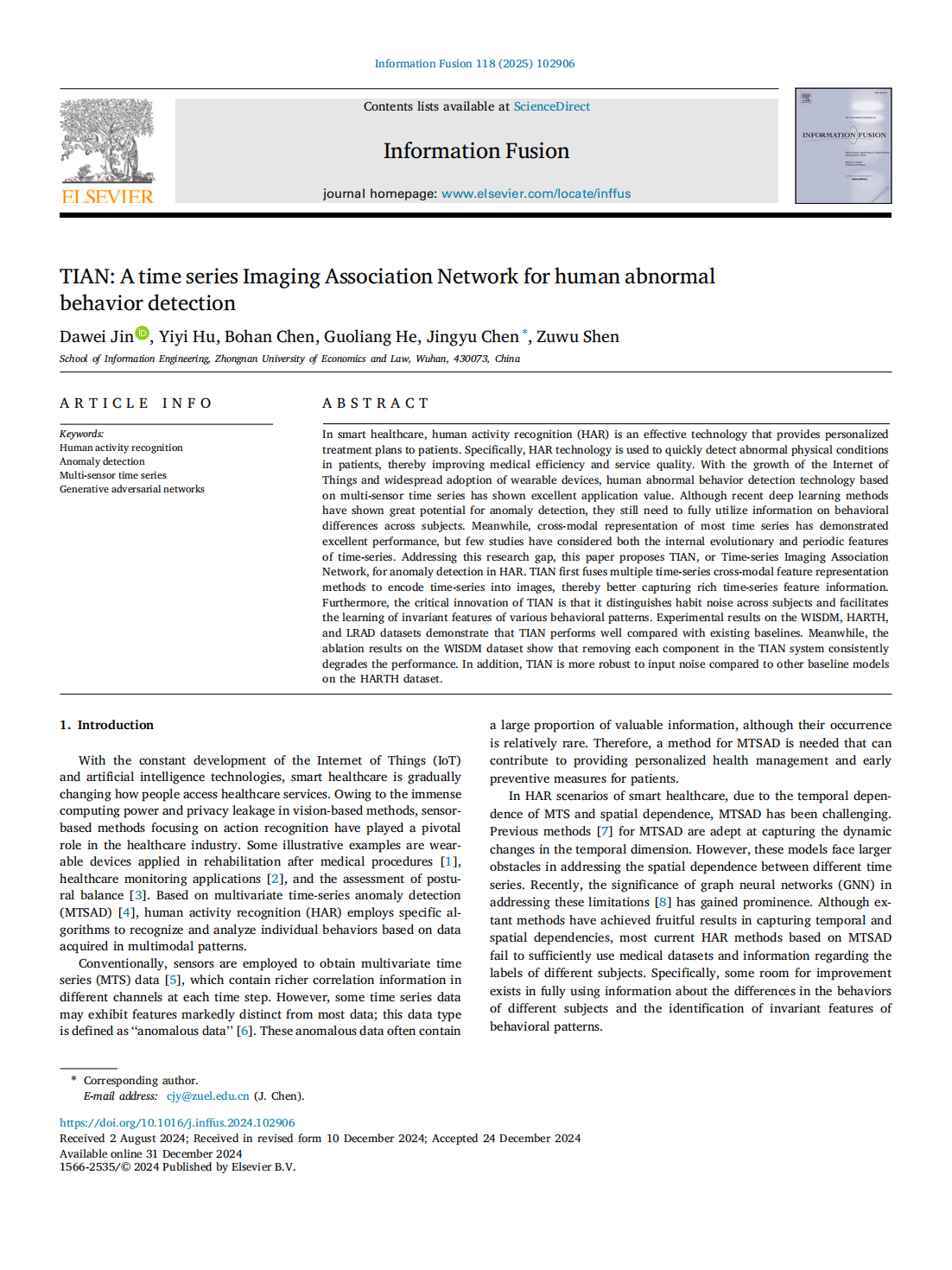 金大卫教授于中科院一区Top期刊《Information Fusion》(A类)上以第一作者发表论文:《TIAN: A time series Imaging Association Network for human abnormal behavior detection》