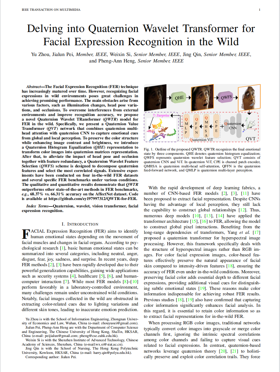 近日,我院青年教师周宇老师与香港中文大学王平安教授团队合作发表论文《Delving Into Quaternion Wavelet Transformer for Facial Expression Recognition in the Wild》,该论文发表于中科院一区期刊《IEEE Transactions on Multimedia》(A类),周宇老师为该论文的第一作者。
