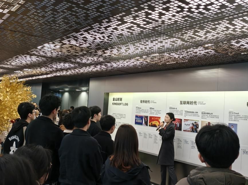 在工作人员引导下,师生参观了位于新发展A座5楼的展厅。展厅内展示了金山软件集团的发展历程和业务成果,讲解员为师生们详细介绍金山的历史沿革及主要业务。随后,师生们在金山A5空中花园拍摄了集体合影。