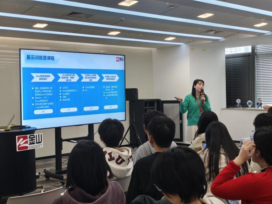 人力讲师徐霞主持本次研学分享课。焦馨蕙和李闪闪依次发表讲话,强调此次参观的目的,鼓励学生们积极提问,深入了解企业需求和工作环境。徐霞详细介绍了金山集团的发展历程,四大业务公司(金山办公、金山云、西山居和金山世游)以及金山的工作环境和员工福利。她还介绍了金山暑期三大训练营及校招岗位,特别是技术类岗位如软件开发工程师,常用语言为C++和JAVA。学生们积极提问,询现场互动热烈。