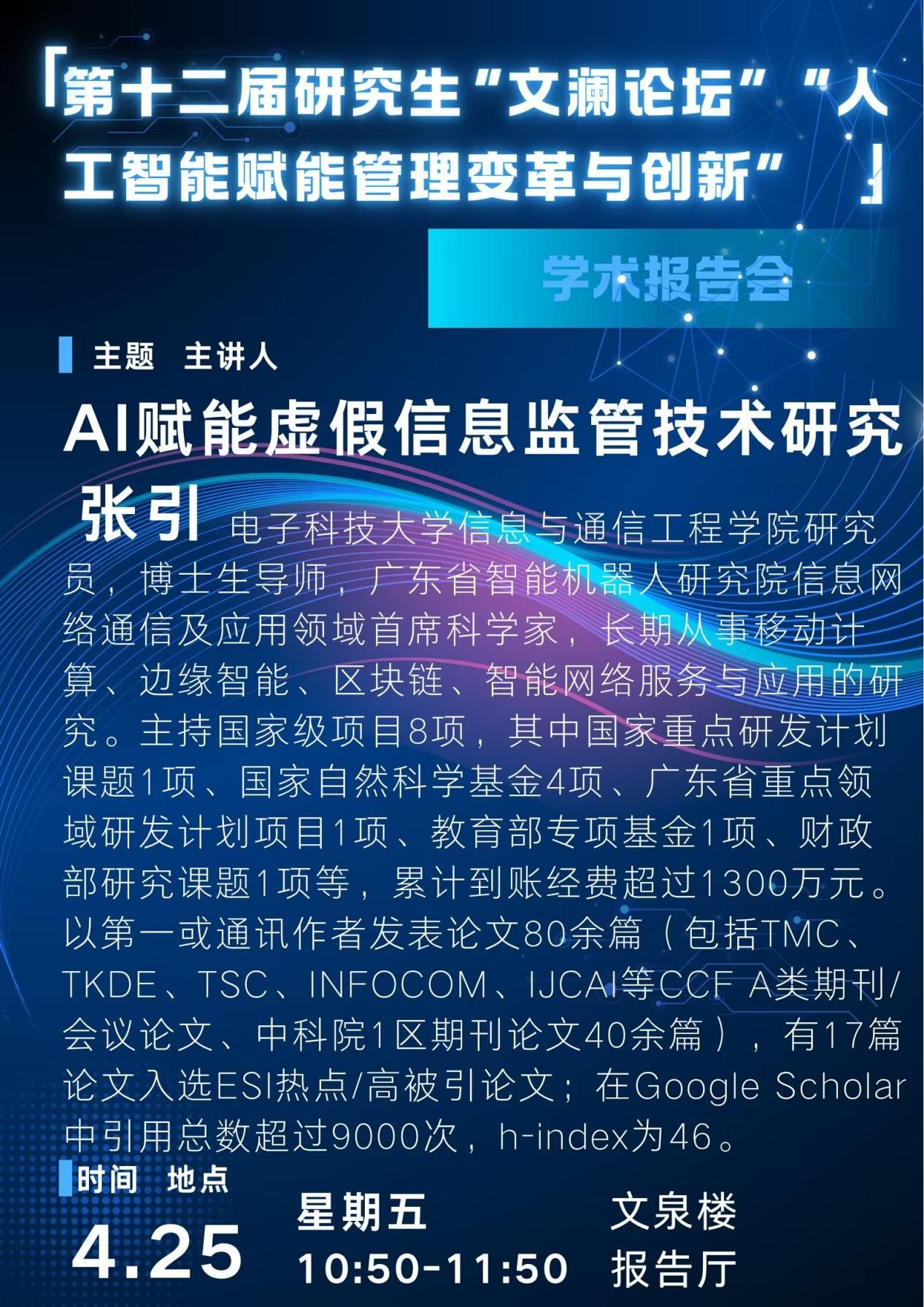 一、时间 2025年4月25日(周五)10:50-11:50二、地点 米兰电竞·(中国区)南湖校区文泉楼报告厅三、主讲人 张引 电子科技大学信息与通信工程学院研究员,博士生导师四、题目 AI赋能虚假信息监管技术研究