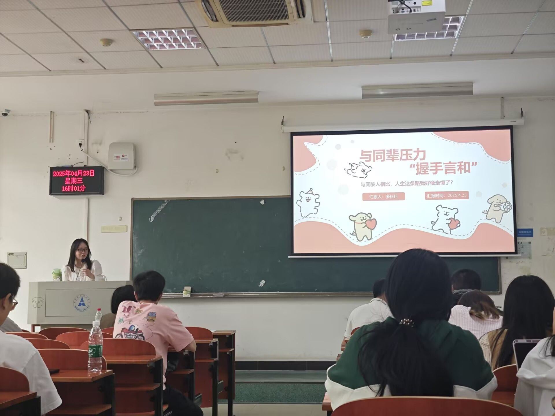 研究生第二党支部和本科生第二党支部本月开展了支部共建活动,本科生第二党支部张秋月同志以《与同辈压力“握手言和”》为题分享了心理健康知识等。同辈压力既有积极的一面,也有消极的一面,关键在于如何正确认识和应对,张秋月同志对此分享了一些实用的应对同辈压力的方法。