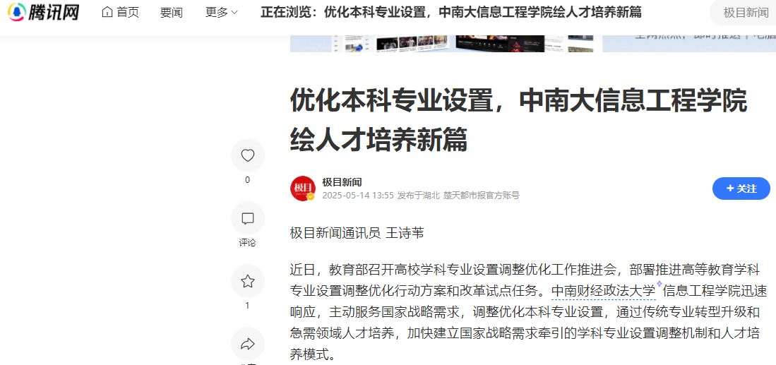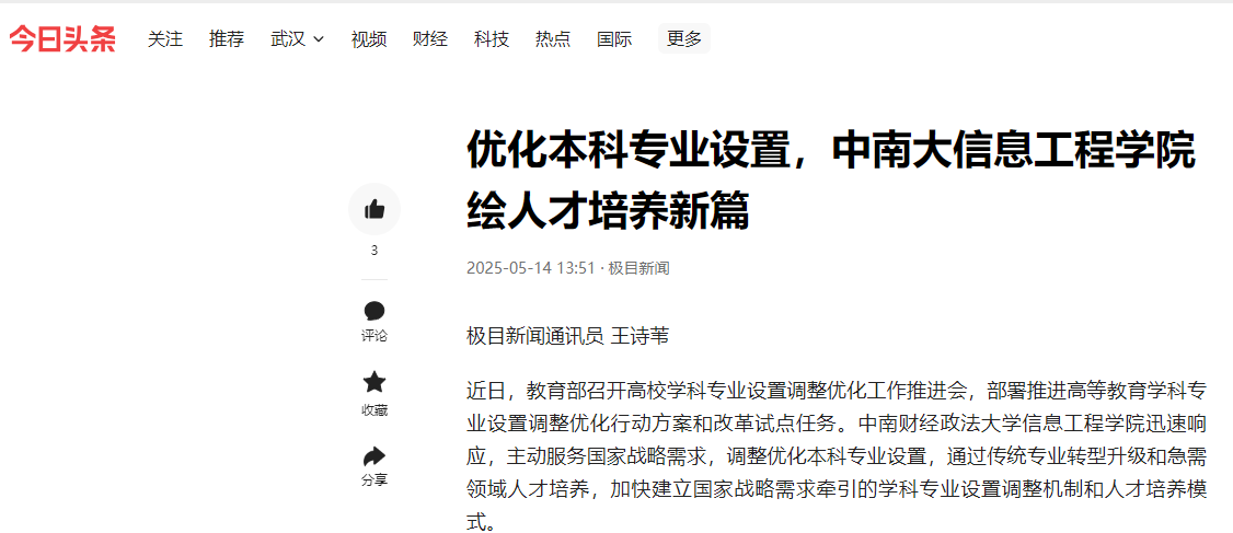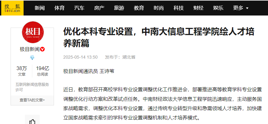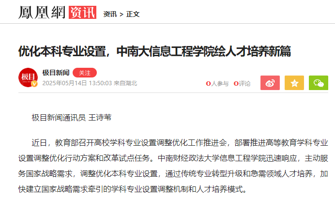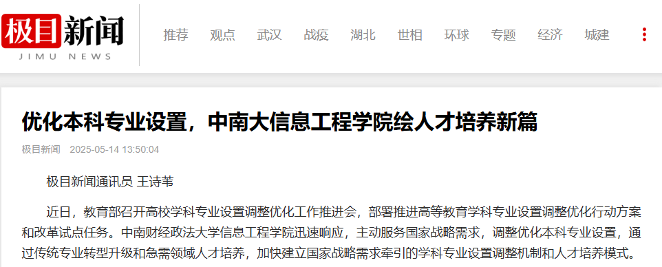 (通讯员 王诗苇)为加快建立科技发展、国家战略需求牵引的学科专业设置调整机制和人才培养模式,我院迅速响应,系统谋划、精准布局、深度融合,通过专业结构优化和专业内涵更新,实施了一系列学科专业设置调整优化工作举措,获得中国教育网、极目新闻、新浪新闻、搜狐新闻、今日头条、凤凰网、腾讯网和汉网等多家媒体宣传报道。