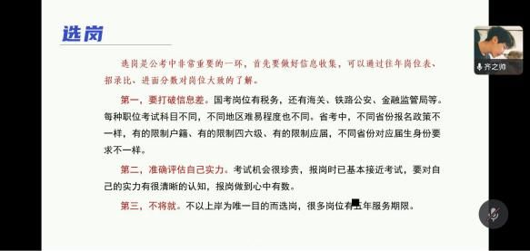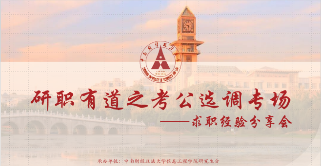 6月29日,开展“研职有道”活动考公选调专场,分享嘉宾分别上岸了湖北省武汉市选调生和湖北省襄阳市选调生。本场活动围绕备考时间规划、课程选择以及笔面试学习策略开展,对比了不同省份选调考情差异,并根据当年的考试情况给出了指导岗位选择策略。