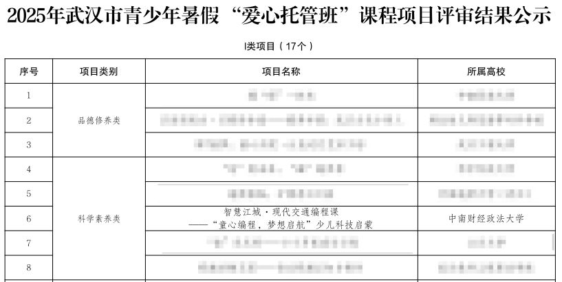 (通讯员 陈孝丁敬 学生通讯员 赵倩 徐静雯)日前,共青团武汉市委和市少工委公布2025年武汉市青少年暑假“爱心托管班”项目评审结果,确定I类项目17个和Ⅱ类项目42个,我院申报的《智慧江城·现代交通编程课——童心编程,梦想启航》项目成功入选I类项目,系我校今年唯一获此殊荣的项目。在本次暑期期间,学院将组织近百名志愿者前往全市378个青少年空间,面向超万名青少年授课。