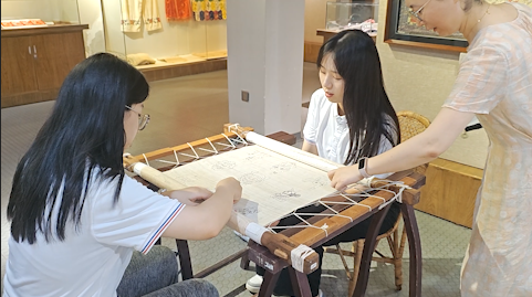 团队先后走访夏布绣博物馆与夏布文化体验村,系统考察夏布的历史演变、工艺特色及其在当代的艺术表达与文旅应用。在博物馆中,成员细致观摩夏布从苎麻原材料到精美艺术品的升华过程,深入了解融合夏布织造与刺绣技艺的省级非遗——夏布绣;在体验村,团队调研了集文化展示、手工体验与产品销售于一体的一站式文旅模式,为思考非遗活态传承与创新开发积累实践经验。