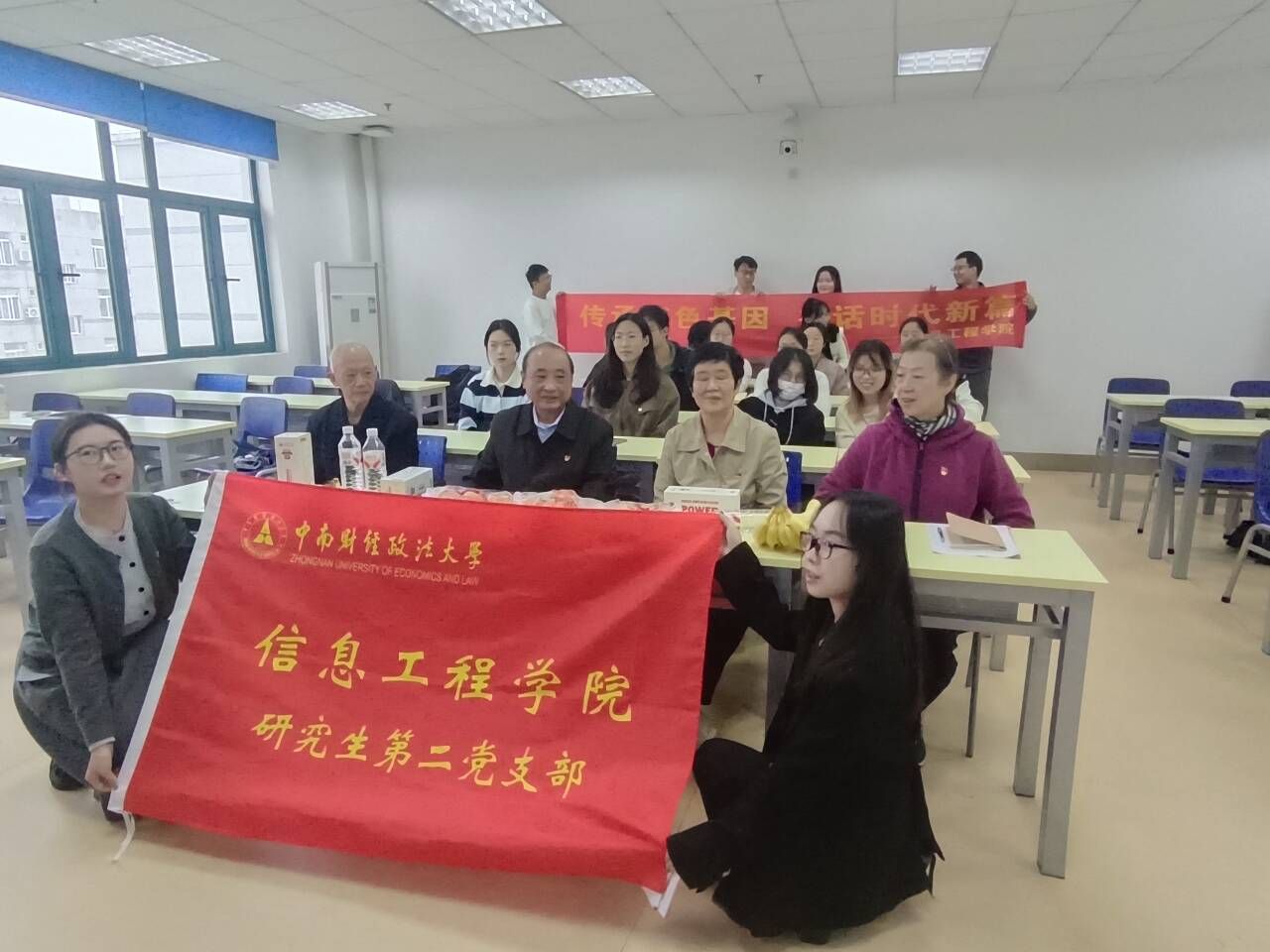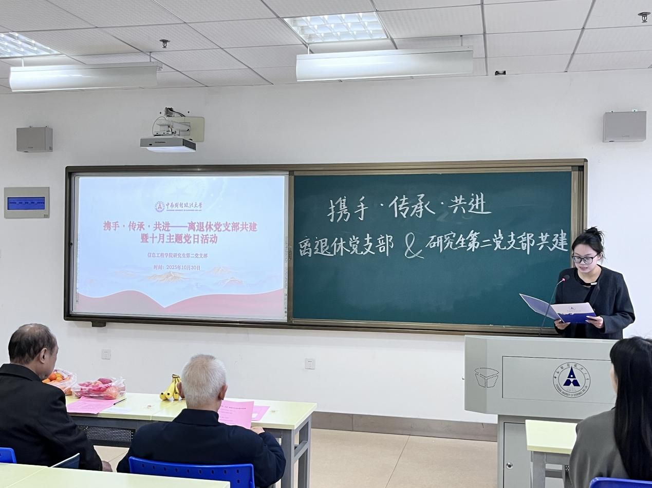 10月30日上午9:30,我院研究生第二党支部联合离退休人员党委在文澴楼539教室开展了离退休党支部共建暨十月主题党日活动。离退休党委副书记胡江滨、首义第二党支部书记路云霞、宣传委员刘燕玲、支部成员刘绍金出席。本次活动以“携手·传承·共进”为主题,搭建“面对面交流、心贴心传承”的互动平台,既让青年党员从老同志奋斗历程中感悟红色初心、汲取精神养分,也让老党员感受组织关怀与青年活力,最终实现“经验传帮带、活力双向赋”的党建新成效,为支部党日活动注入多元动能,强化党性教育实效。