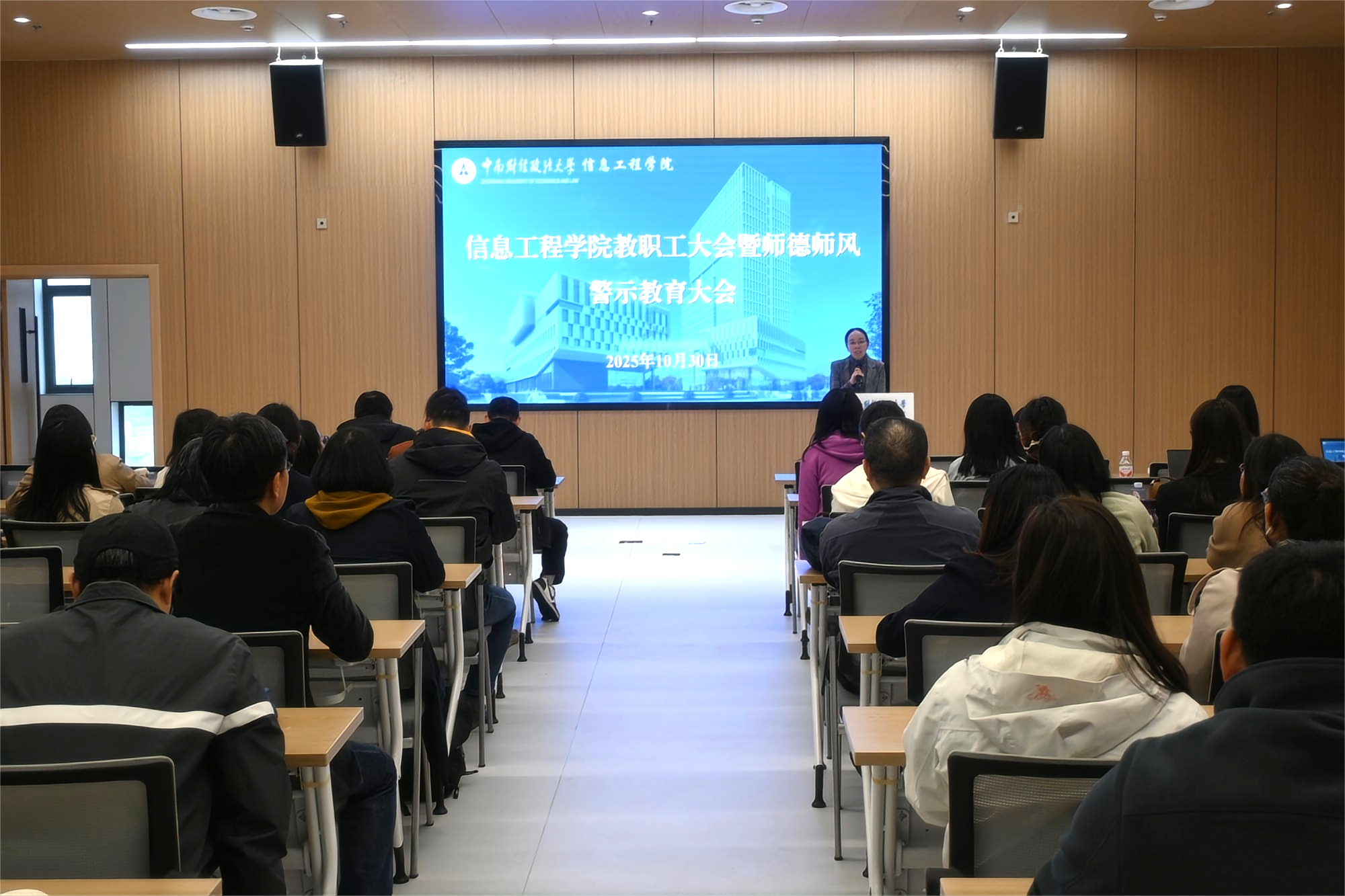 (通讯员 杨晨) 为进一步深入贯彻落实党的教育方针,强化师德师风建设,完善学院绩效考核机制,广泛凝聚发展共识,推动院系治理改革,学院于10月30日下午在双创楼B栋402会议室召开教职工大会暨师德师风警示教育大会。学院全体教职工参会,会议由党委书记王芹主持。