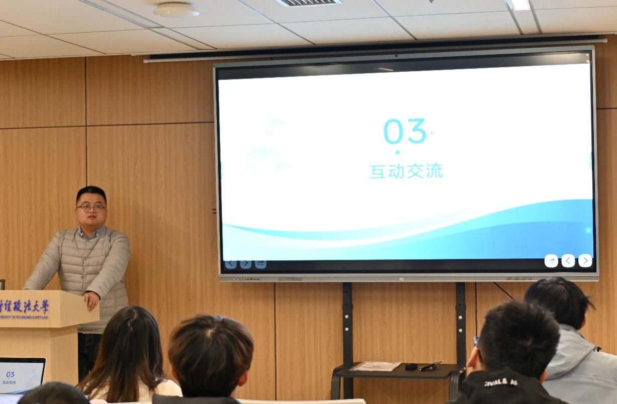 在交流环节,吴老师结合智能建造与人因安全领域的前沿研究,生动展示了工程管理与信息技术融合创新的实践路径。他鼓励研究生将个人学术追求融入国家发展大局,以“博文明理、厚德济世”的校训精神指引科研方向,为实现科技自立自强贡献智慧力量。