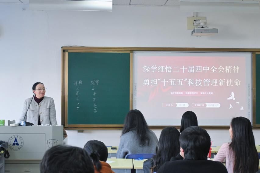 随后,学院党委书记王芹同志以“深学细悟党的二十届四中全会精神,勇担‘十五五’科技管理新使命”为题作专题讲座。她从“锚定历史坐标、把握战略指引、对标国家战略”三个维度,深入阐释了当代研究生党员所肩负的科技报国使命,引导大家思考如何将专业学习融入建设科技强国、网络强国的时代征程,报告极大地激发了党员们的使命感和责任感。