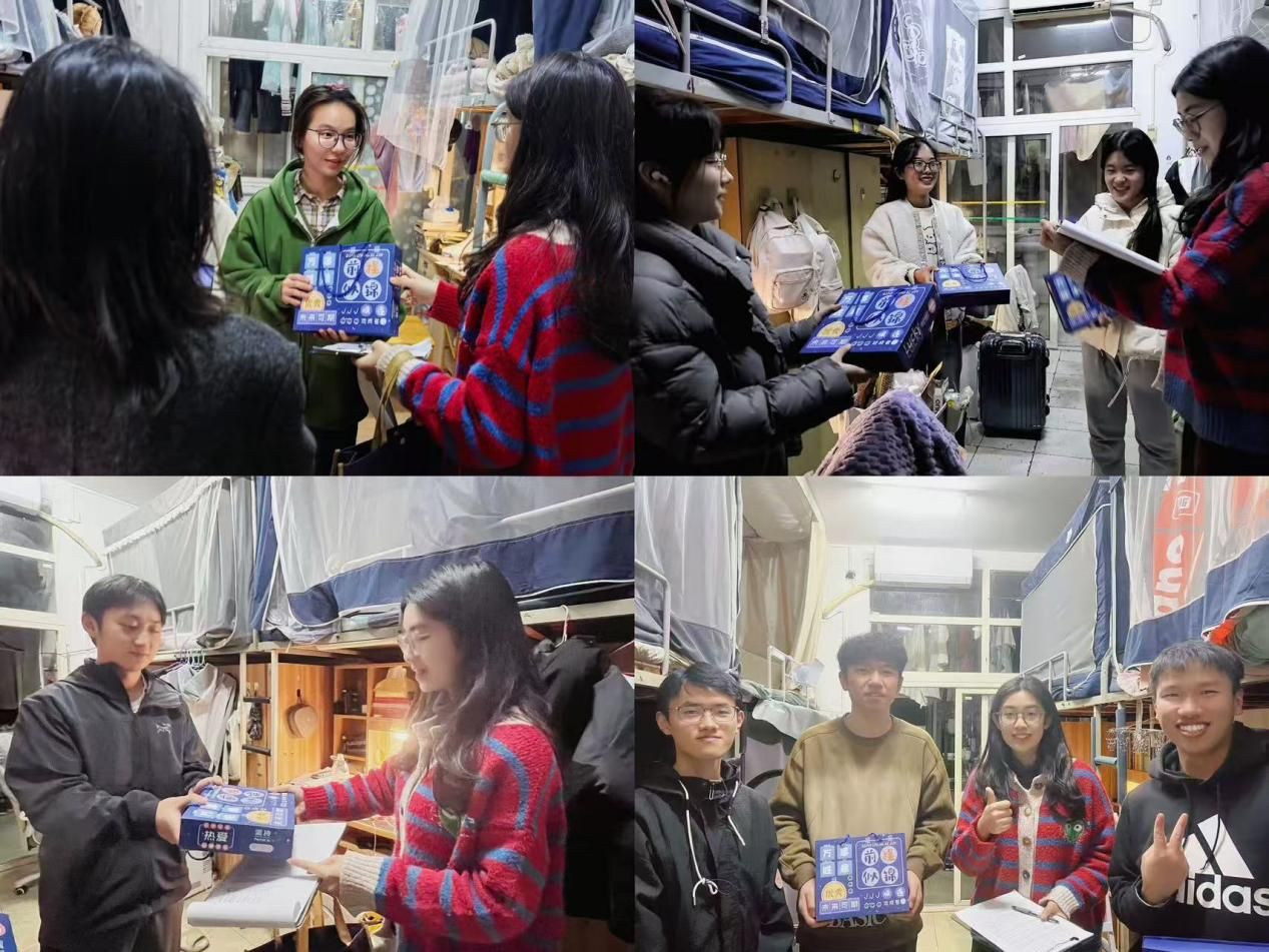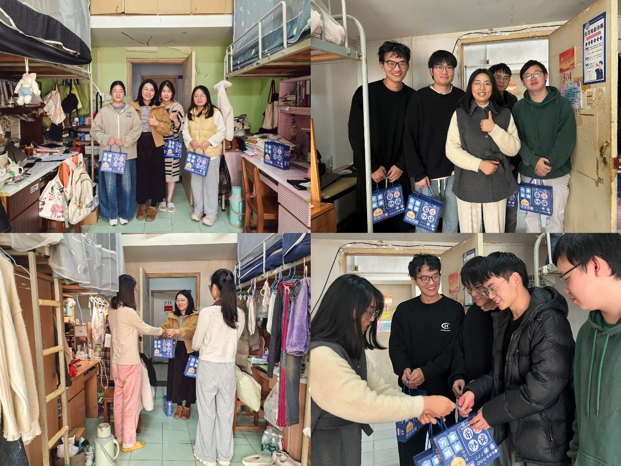 在同一天,2022级辅导员陈孝丁敬和王安琪走进学生宿舍,亲手将心意满满的礼盒和热烈诚挚的祝福送给同学们。在走访中,老师们细心询问大家的复习进度、求职进展与生活状况,叮嘱同学们注意劳逸结合,并提醒大家学院永远是坚实的后盾。一次次温暖的探访,一句句贴心的叮咛,切实拉近了师生距离,也让在奋斗路上拼搏的学子感受到了师生之间如家人般的温暖与力量。