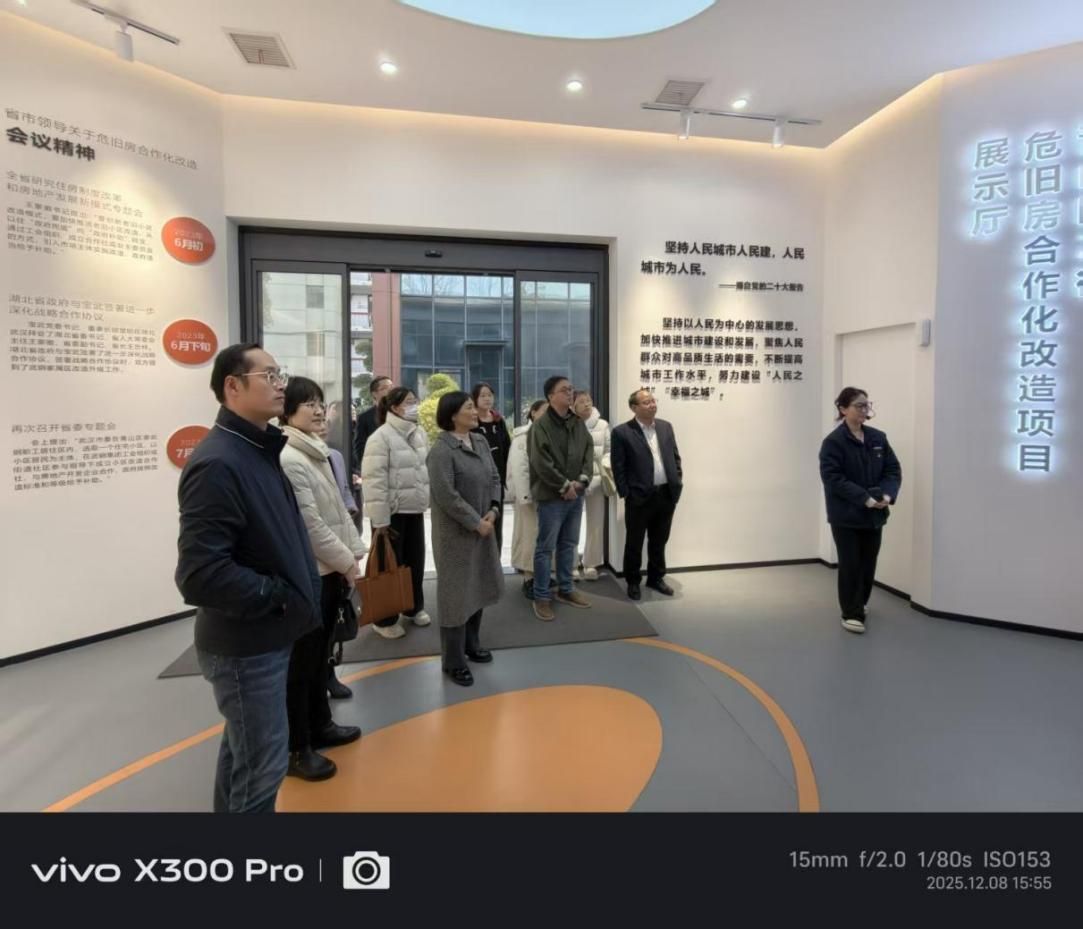 石教澜还带领师生实地参观了中国一冶承建的湖北省首个“住宅合作社”模式危旧房改造项目——青山区21街危旧房合作化改造工程。该项目实现了 “居民主导、政府支持、企业参与”的创新模式,中国一冶数字建造技术赋能破解了狭小场地施工难题:通过BIM与进度计划深度绑定,实现精准化物料调度与工序衔接;提前近百天完成了狭小场地施工,国家省市领导以及许多兄弟单位到该项目来进行参观学习。