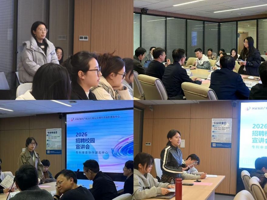 宣讲会伊始,师生共同观看了专利审查协作湖北中心的招聘宣传片,全面了解了该中心的发展历程、主要职能、机构文化及人才引进方向。随后,相关负责人系统介绍了2026年度招聘计划,包括岗位设置、专业要求、培训体系、薪资福利与职业发展通道等,并结合实际案例,深入阐述了知识产权领域的工作特点。