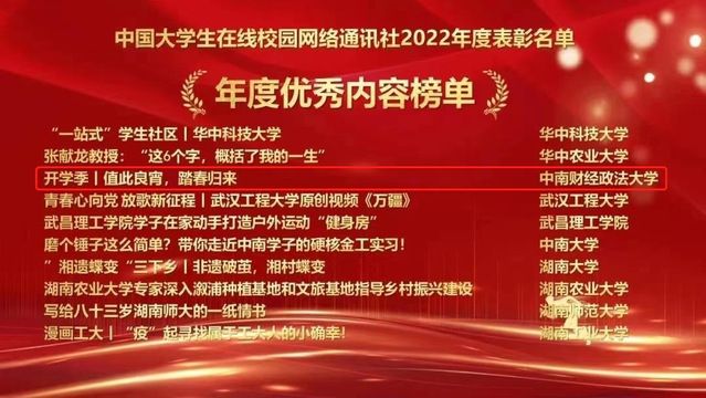 新闻网讯 1月10日,教育部中国大学生在线召开2022校园号建设暨校网通工作年会,公布了中国大学生在线校园网络通讯社2022年度表彰名单。米兰电竞·(中国区)在全国600多所高校中脱颖而出,荣获“十佳校网通站”“优秀组织单位”“年度优秀内容”等多项荣誉,党委宣传部吴世杰老师获“校网通十佳指导老师”称号,中南大学子莫唐嫣语获“十佳校园媒体人”称号,马秋颖入选“优秀校园媒体人”。