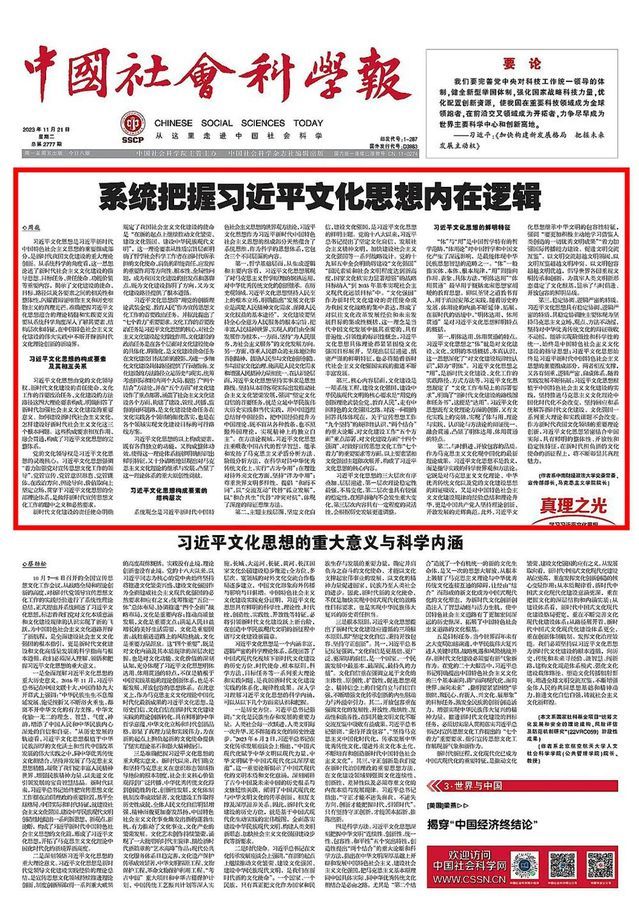 新闻网讯(通讯员 崔桢桢)11月21日,《中国社会科学报》头版头条“真理之光”专栏刊发校党委常委、党委宣传部部长兼马克思主义学院院长周巍理论文章《系统把握习近平文化思想内在逻辑》,文章从习近平文化思想的构成要素、结构层次和鲜明特征等方面进行阐释。