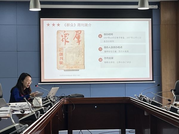 覃虹同志为大家讲授专题党课“抗战时期中国共产党新闻宣传工作探析——以《群众》周刊为例”。通过介绍《群众》的办刊历程、特色内容等,为大家生动展示了红色刊物的红色印记。