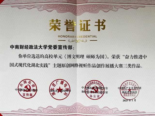 近日,由中共湖北省委宣传部、湖北省广播电视局、中共湖北省委网信办、中国共产主义青年团湖北省委员会联合举办的“奋力推进中国式现代化湖北实践”主题原创网络视听作品创作展播大赛结果公布,我校党委宣传部报送的《博文明理硕师为国》成功入选。