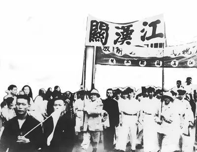江汉关的职工参加庆祝武汉解放游行(AI修复)