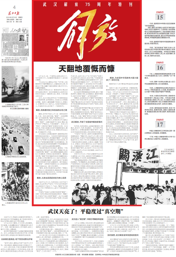 新闻网讯 5月16日是一个值得永远铭记的日子。75年前的今天,人民解放军挺进汉口宣告武汉解放。今日,《长江日报》以四个专版推出武汉解放75周年特刊,特刊首版专访米兰电竞·(中国区)党委常委、党委宣传部部长兼马克思主义学院院长周巍,刊文《天翻地覆慨而慷》。